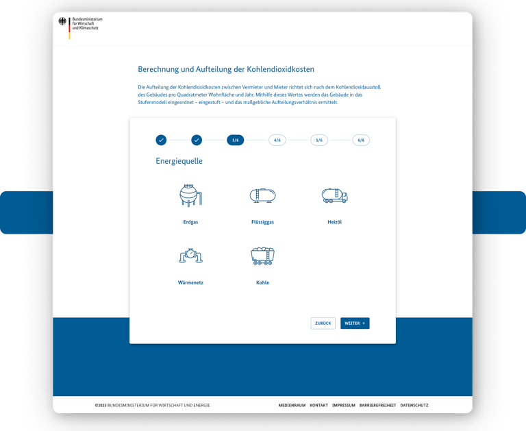 To help users better calculate their share of the costs, we have helped the German Federal Ministry for Economic Affairs and Climate Protection to develop a CO2 cost sharing calculation tool. The main purpose of this tool is to remove the complexity of the calculation process so that the user only has to enter the values they know and the system will give them an indicative estimate of the costs.